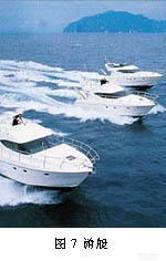用于船艇制造的多轴向经编织物通常以玻璃纤维、碳纤维、芳纶纤维等为原料,同时结合新型的成型和复合技术,这样形成的产品除了可减少纱线的使用量以及减轻船体重量外,还可以减少合成树脂的用量、缩短浸渍时间等。卡尔迈耶马利莫公司曾联合德累斯顿大学和开姆尼茨Saxon纺织研究所采用玻璃纤维多轴向经编织物作为骨架材料,开发了一艘尺寸为4090mm×730mm×320mm,船体厚度只有2~3mm,重量仅为27kg的轻质高强的玻璃钢船。可以说,用玻璃纤维多轴向经编织物生产的船只与其它材质船只相比具有更多优点,它质量轻、船速快、节油、抗碰撞和抗风浪性能好、耐腐蚀以及抗老化性好。用强度相同的多轴向经编织物替代机织物生产游艇(图7),可节省30%的玻璃纤维,使游艇生产者获得相当显著的经济效益[6]。多轴向经编织物在船艇制造上的大量应用,无疑给多轴向经编增强材料的生产企业带来了无限的商机。
